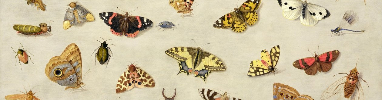Jan van Kessel (1626-1679) was a member of the distinguished Brueghel clan of artists. His uncle, Jan Brueghel the Younger, was among his teachers. Van Kessel’s delicate animalia studies were enormously popular in the Netherlands in the 1650s, a time when interest in the natural world was booming, and when microscopes were beginning to reveal the diversity and intricacy of the insect world. So in their historical context, van Kessel’s compositions function both as works of art and as contributions to fields of science such as botany, entomology, conchology, taxonomy. But as an artist Jan van Kessel could also be playful: in one famous painting he arranged an assortment of caterpillars in such a way as to spell out his own name.