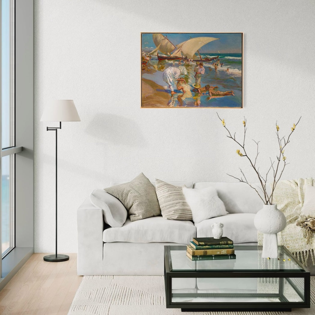 Painted in 1908, Beach of Valencia by Morning Light captures Sorolla’s radiant vision of the Mediterranean coast at daybreak. Sunlight floods the shoreline, illuminating the figures, shimmering water, and soft sand with the warm brilliance that defines Sorolla’s most celebrated works.