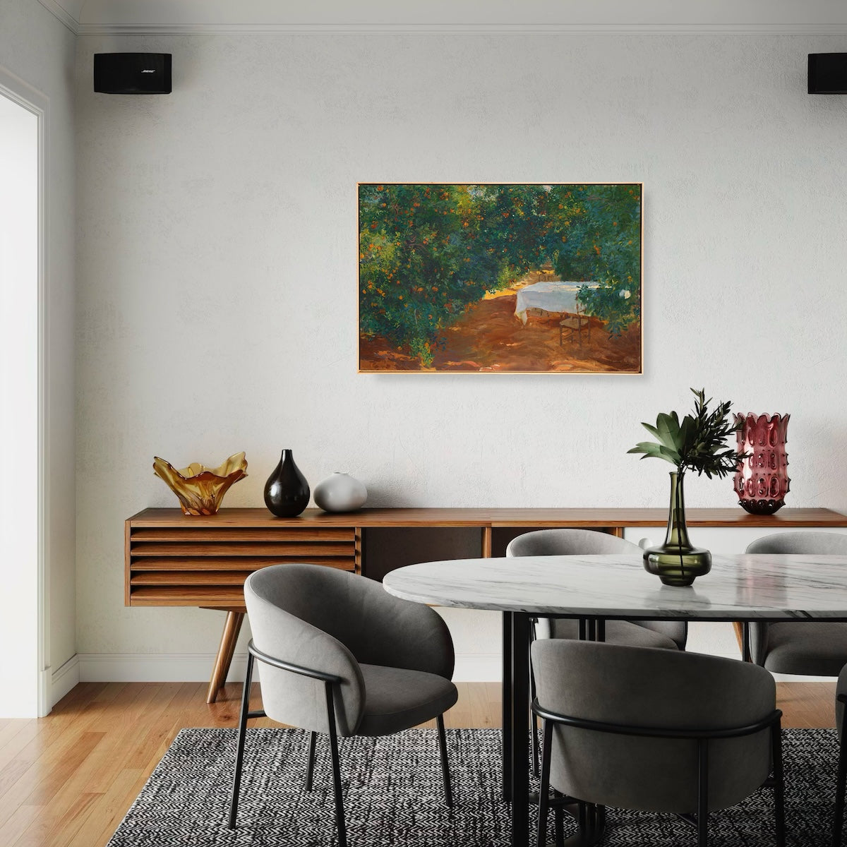 With its vibrant palette and sun-filled tranquillity, El Jardín de Naranjos brings warmth, openness, and Mediterranean elegance to any interior.