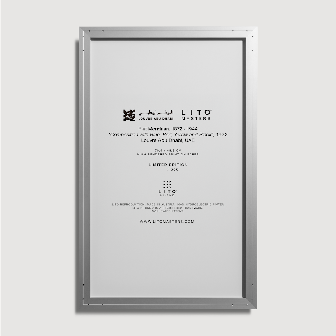 Diese LITO Masters Edition wurde mithilfe unseres patentierten Verfahrens aus hochauflösenden Museumsscans reproduziert und gibt die scharfen Kontraste, die subtilen Oberflächenstrukturen und die exakten Farbverhältnisse, die Mondrians neoplastischen Stil prägen, originalgetreu wieder. Die Klarheit der Linien, die matte Farbtiefe und die bewusst gewählte Anordnung der Elemente werden mit außergewöhnlicher Präzision wiedergegeben.